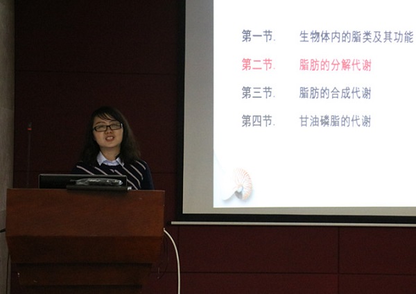 主讲《生物化学》课程的何焱副教授首先开始讲课,她用“为什么多吃碳水化合物容易蓄积脂肪发胖?”、“减肥药左旋肉碱真的有效吗?”以及“为什么说有氧运动才能健康减脂?”三个与生活息息相关的问题导入本次课程所讲章节《脂类代谢》。随后,何炎副教授采用三组流程图,清晰地介绍了脂肪分解代谢中脂肪的酶促降解、甘油代谢转化为葡萄糖以及脂肪酸β-氧化的过程。