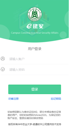 微信公众号查找“e建安”并关注,或登陆网址://ejan.admgo.net:8083/,点击“我的业务”进入,首次办理需要注册。教职工通过12位工号和8位生日进行登录、学生通过学号进行登录,常驻人口通过访客注册进行登录,系统会根据注册人员的身份自动分配权限,请大家不要错用身份登录。