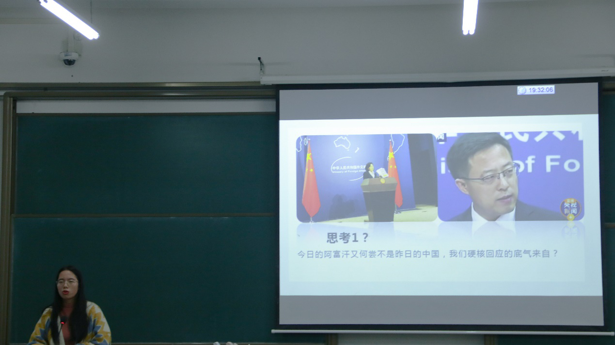 会议开始,主持人陈宁欣介绍了一张经中国外交部发言人赵立坚转发的漫画,切入事件主题。接着,主持人为大家播放了相关视频,让同学们更好地了解事件的前因后果。