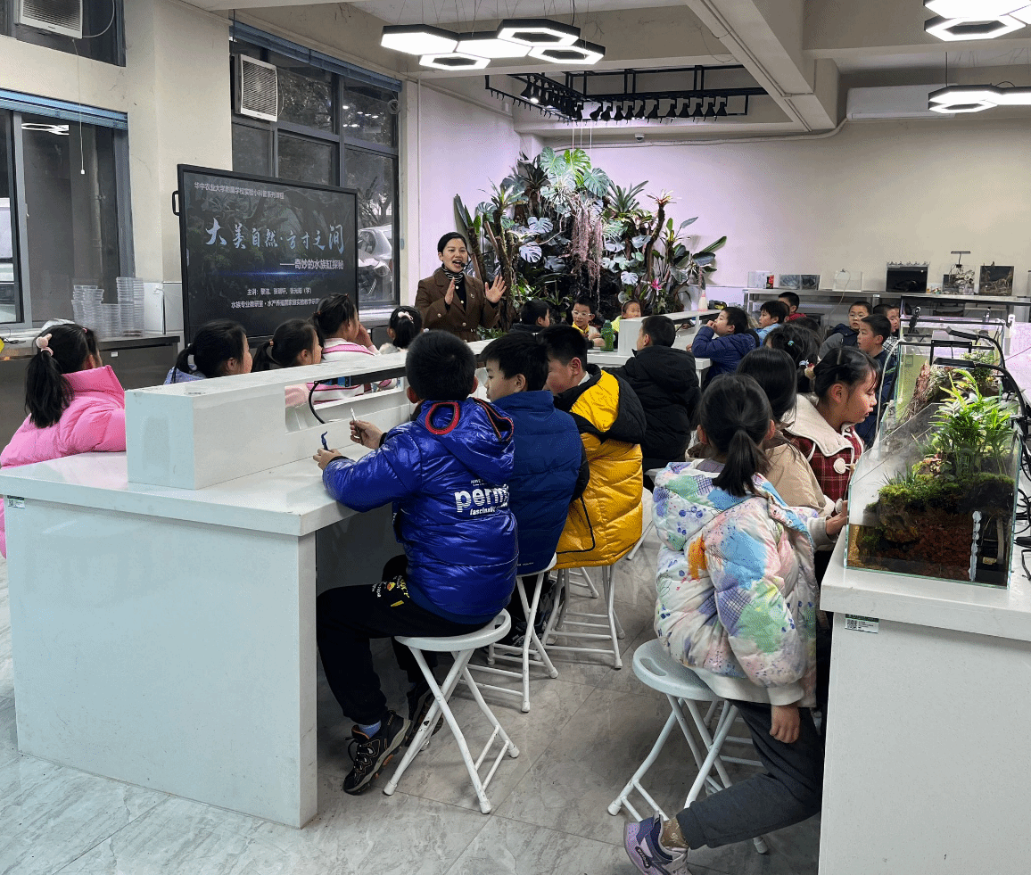12月27日下午,水产养殖国家级实验教学示范中心水族景观教室迎来了华农附属学校三年级(3)班的38名同学,中心副主任黎洁老师和中心教师张瑞轩为同学们带来了一场题为“大美自然•方寸之间——奇妙的水族缸探秘”的科普课程。