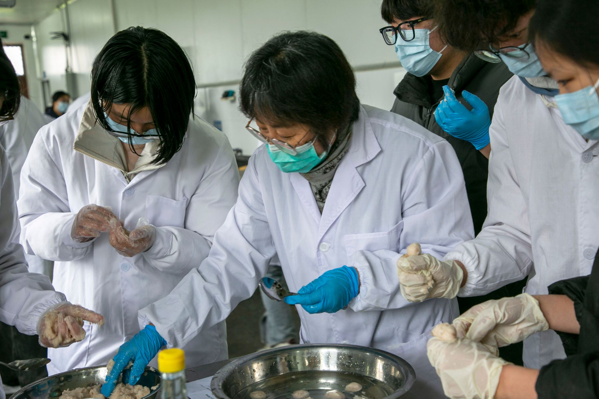 同学们将解冻好的巴沙鱼柳放入绞肉机中打碎,再依次添加食盐、土豆淀粉、料酒等调味料进行擂溃,至鱼糜在水中可以浮起。在擂溃搅拌过程中,大家齐心协力,控制好温度,让鱼糜呈现出良好的状态,便于后续掐制鱼丸。张秀杰老师手把手向同学们展示了鱼丸的制作方法,为大家掐制出一个个精美的鱼丸。