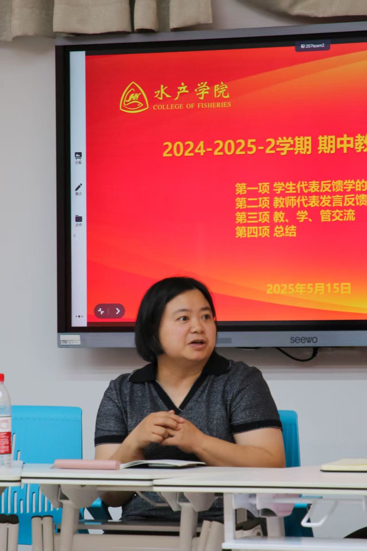 于第四教学楼C207召开2024-2025学年第二学期期中教学检查师生座谈会。实践教学管理处处长刘震、思想政治教育管理处梁平军、本科生院运行科向佳玲、基层教学组织负责人及各年级师生代表出席了会议。会议由a动漫