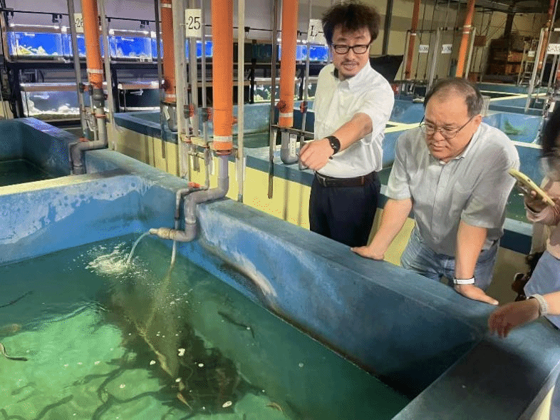 次日上午10点,访学团正式开启了本次学术交流之旅。上午在刘志强博士的引导下,访学团首先参观了群山大学校园,并对其整体布局和设施有了初步的了解。下午,访学团来到国立群山大学海洋科学大学楼。深入探访了鱼饲料的存储和制作区域。透过透明的存储罐,访学团成员观察到不同颗粒大小的饲料,直观感受到水产养殖中“精准喂养”的重要性。随后,代表团参观了校内养殖场,该养殖场分为室内和室外两个部分,是学生实习的重要基地。养殖场采用先进的自动水循环系统,水流通过多层过滤装置时,杂质被有效拦截,确保水体的洁净。据介绍,养殖场内共饲养了50多种淡水鱼类,从常见的鲤鱼、鲫鱼到珍稀的观赏鱼,种类繁多。