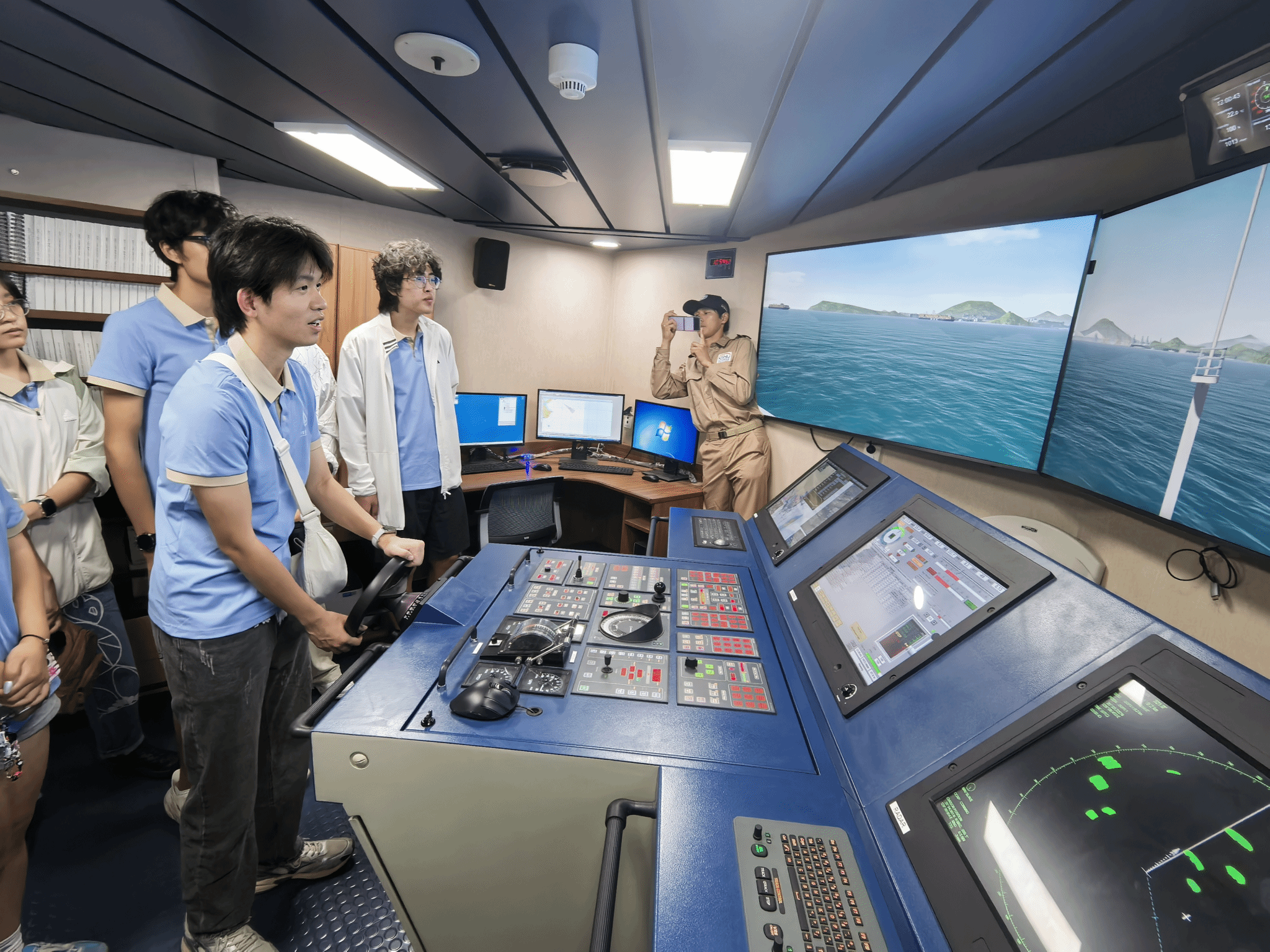 8月4日,访学团登上了海林号科考船。工作人员介绍说,群山大学相关专业的学生每年都会在此实习,以增强专业能力。在参观过程中,工作人员详细讲解了科考船的历史与构造,并带领我们参观了食堂、船长室和控制室。访学团成员通过虚拟实验模拟了船体的控制,切身体验了海洋科学技术。