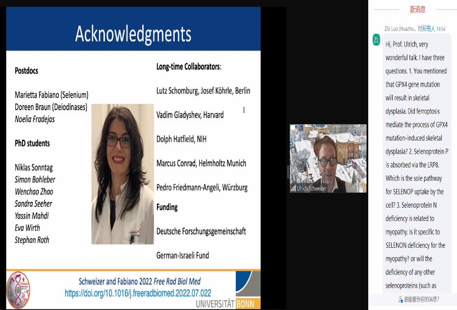 报告结束后,罗智教授同Schweizer教授就“GPX4基因突变会导致骨骼发育不良,铁死亡是否介导GPX4突变诱导的骨骼发育不良?硒蛋白P通过LRP8途径吸收,这是否是细胞摄取SELENOP的唯一途径?硒蛋白N缺乏会导致硒蛋白N相关肌病,其他硒蛋白缺乏是否也会导致相关肌病的发生?”等问题展开了讨论交流。经过对这些问题的探讨,大家对硒蛋白的生物合成及其功能的研究新进展又有了进一步的认识。