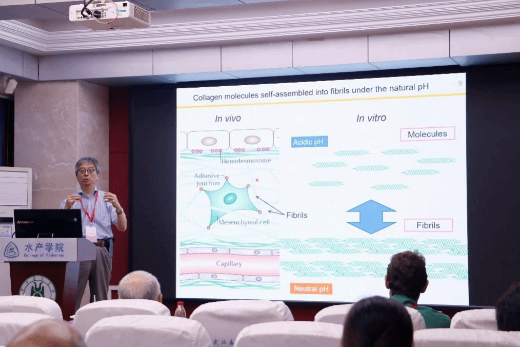 北海道大学Yasuakl TAKAGI教授以胶原相关材料在组织工程及水产加工领域的研究为主题,通过介绍胶原蛋白分子在自然 pH 条件下自组装成纤维的过程,包括体内外不同环境下的变化情况,阐述了细胞与胶原纤维相互作用的机制。展示了细胞培养、组织修复、细胞分化、人工关节应用、水产加工方面的研究内容与成果。