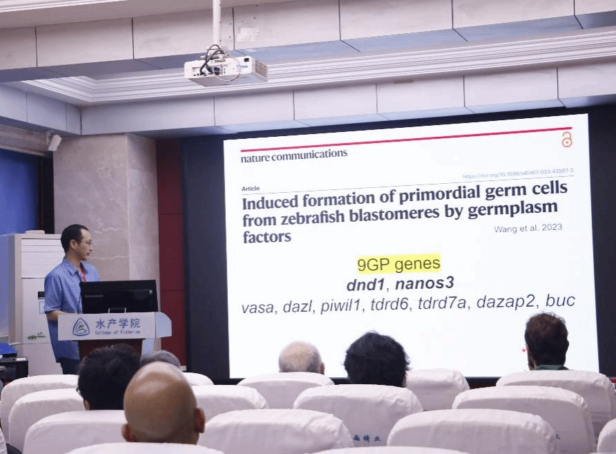 4月15日,日本北海道大学Toshiya NISHIMURA教授开场作了“通过两个生殖质因子诱导鱼类胚胎原始生殖细胞”的报告。在报告中,NISHIMURA教授提出在鱼类原始生殖细胞形成过程中,dnd1 和 nanos3 基因是否必需、是否足以促使原始生殖细胞形成等问题,引发师生对鱼类生殖细胞发育机制研究的思考。报告涉及多种生殖质成分相关基因,通过基因敲低和过表达筛选探究哪些基因是必需的。研究成果展示了诱导的原始生殖细胞发育成精子和卵子的情况,包括在雌雄个体性腺中的标记情况以及受精率数据,展示了诱导原始生殖细胞发育成配子方面取得成果。为鱼类生殖生物技术发展提供理论和技术支持。