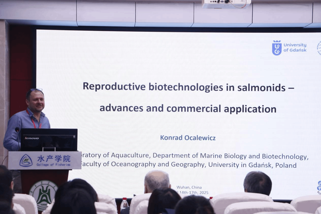 波兰格但斯克大学的Konrad OCALEWICZ教授作了题为“鲑科鱼类的生殖生物技术——进展与商业应用”的报告。报告系统阐述了三倍体诱导、人工雌核发育、雄核发育等核心技术在鲑鳟鱼类养殖中的应用突破。他强调,该技术体系已实现从实验室到规模化生产的转化,为可持续水产养殖提供了重要解决方案。