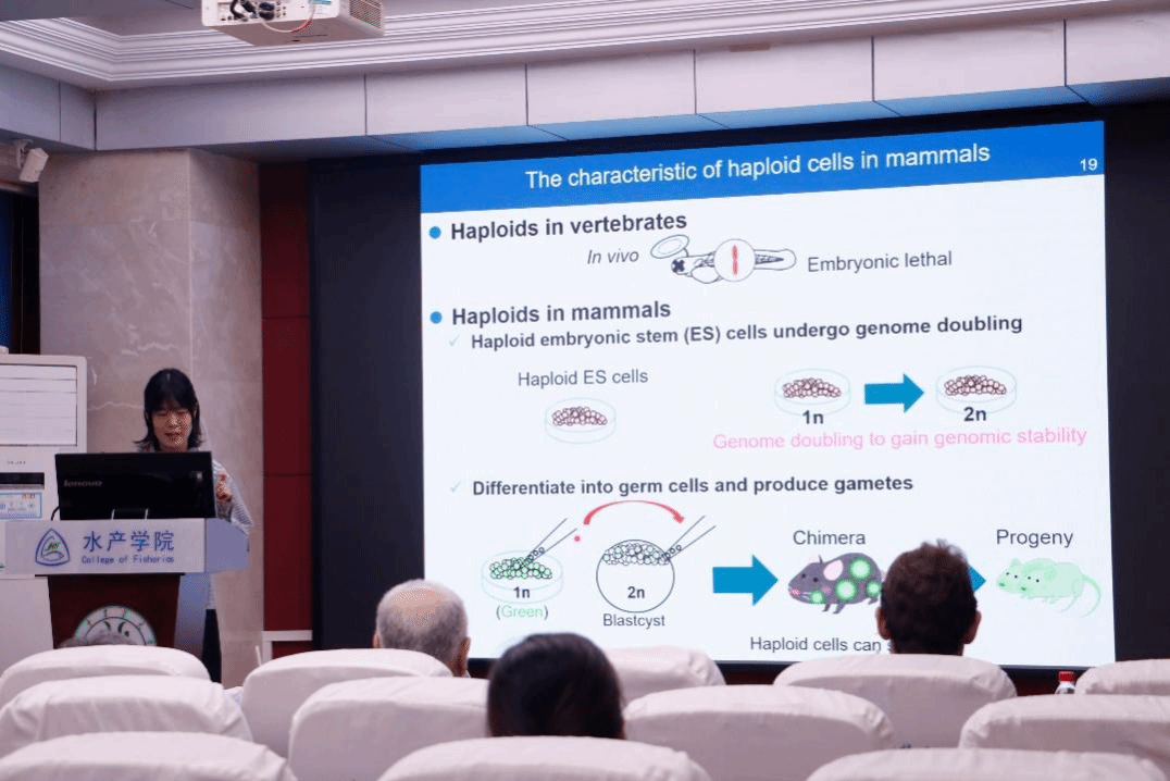 曹小娟教授作了题为“有丝分裂缺陷导致鱼类不减数精子发生”的报告。报告揭示了细胞周期调控关键基因cdk1/2和分离酶基因espl1在鱼类不减数精子发生中的重要作用。通过基因敲除实验,她所带领的团队发现Cdk1和Espl1功能缺陷会导致精母细胞有丝分裂异常,进而产生二倍体不减数精子。这类不减数精子与正常卵子结合后可形成三倍体。通过架设‘三倍体桥’成功获得了人工四倍体。人工四倍体与野生型二倍体交配后,产生了全三倍体群体,孵化率达80%以上。该成果为水产养殖三倍体育种提供了新的技术路径,可解决传统温度休克或静水压诱导法存在的效率低下等问题。