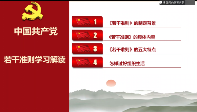 会上,路雨同志就《关于新形势下党内政治生活的若干准则相关内容》文件的制定背景、具体内容以及特点进行深刻阐述,被对怎样过好组织生活发表了自己的看法和见解。他表示《若干准则》是完善“四个全面”战略布局的需要;是深化全面从严治党的需要;是解决党内存在突出矛盾和问题的需要。作为一名共产党员要坚定理想信念;坚持党的基本路线;坚决维护党中央权威;严明党的政治纪律;保持党同人民群众的血肉联系;坚持民主集中制原则;发扬党内民主和保障党员权利;坚持正确选人用人导向;严格党的组织生活制度;开展批评和自我批评;加强对权利运行的制约和监督;保持清正廉洁的政治本色。《若干准则》以党章为根本依据,坚持问题导向,继承和创新有机统一,体现约束与激励相结合,重点和关键明确。