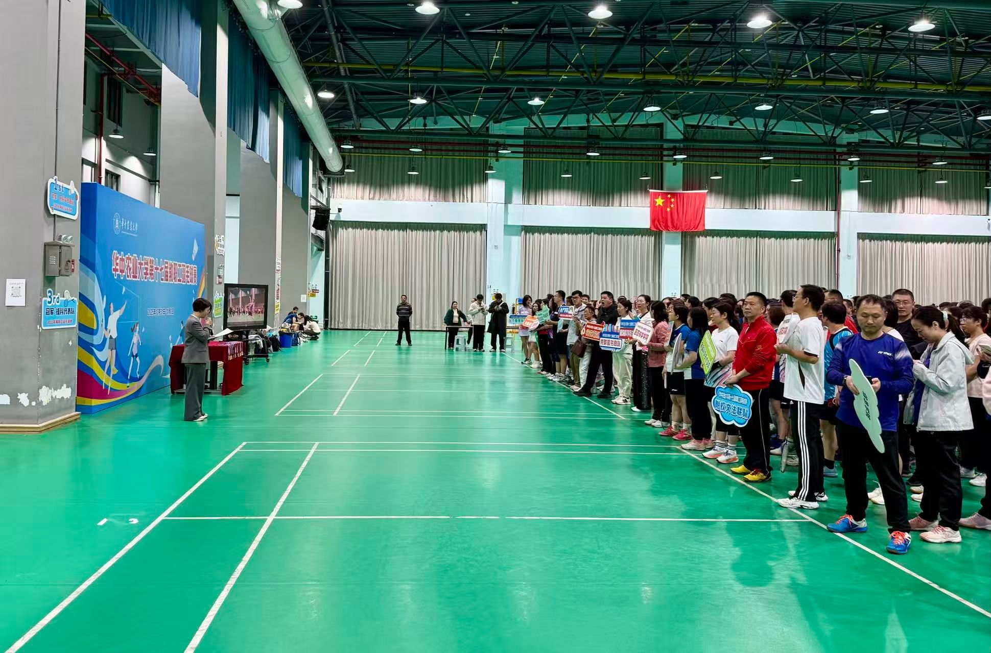 10月31日晚开幕式上,全体人员奏唱国歌,校工会副主席余顺华为教职工羽毛球赛冠军杯“狮山羽鼎”揭幕,资源与环境学院朱姝老师和食品与科技学院许祥瑞同学分别代表运动员和裁判员宣誓。随着校党委书记姚江林宣布比赛开幕并开球,本届教职工羽毛球赛正式拉开帷幕。
