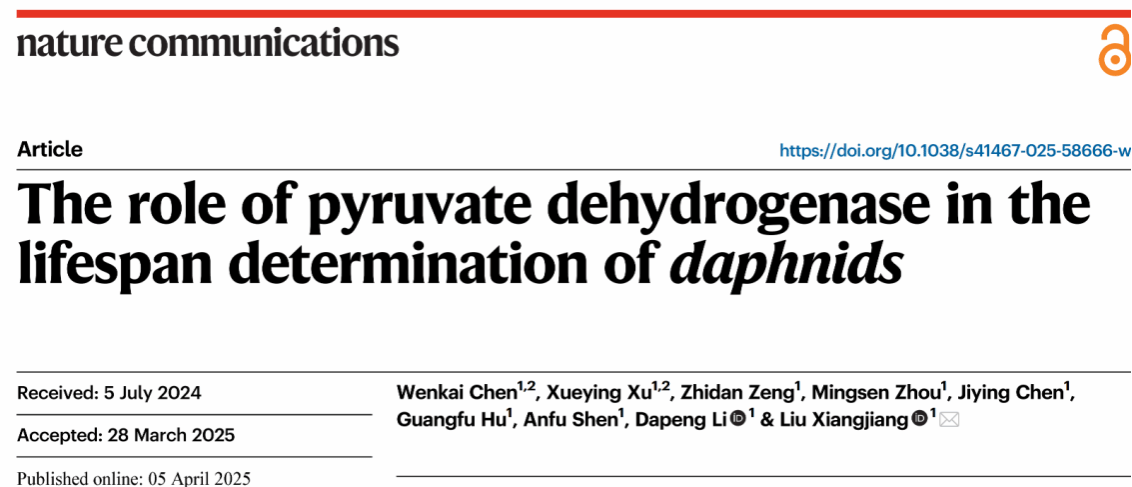 李大鹏教授领衔的鱼类环境生理与健康养殖团队刘香江课题组在Nature Communications期刊上发表题为“The role of pyruvate dehydrogenase in the lifespan determination of daphnids”的研究论文。该研究通过解析枝角类模式生物的代谢进化策略,发现丙酮酸脱氢酶(pyruvate dehydrogenase,PDH)活性的降低是延长寿命的关键因素之一,为揭示能量代谢与寿命调节的关键分子机制提供了新见解。