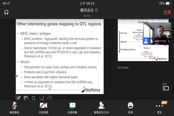 (通讯员 王靖雯 供图 王靖雯)7月28日上午,a动漫 第20009期水产新视界之水产讲坛系列学术活动在腾讯会议线上举行,挪威Nofima研究所的Nicholas Robinson研究员作了题为“Application of genomics for boosting disease resistance and stress resilience in fish and shellfish”的学术报告,吸引了a动漫 师生及湖南农业大学、河南师范大学等总计200多人参加此次报告会,会议由a动漫 高泽霞教授主持。